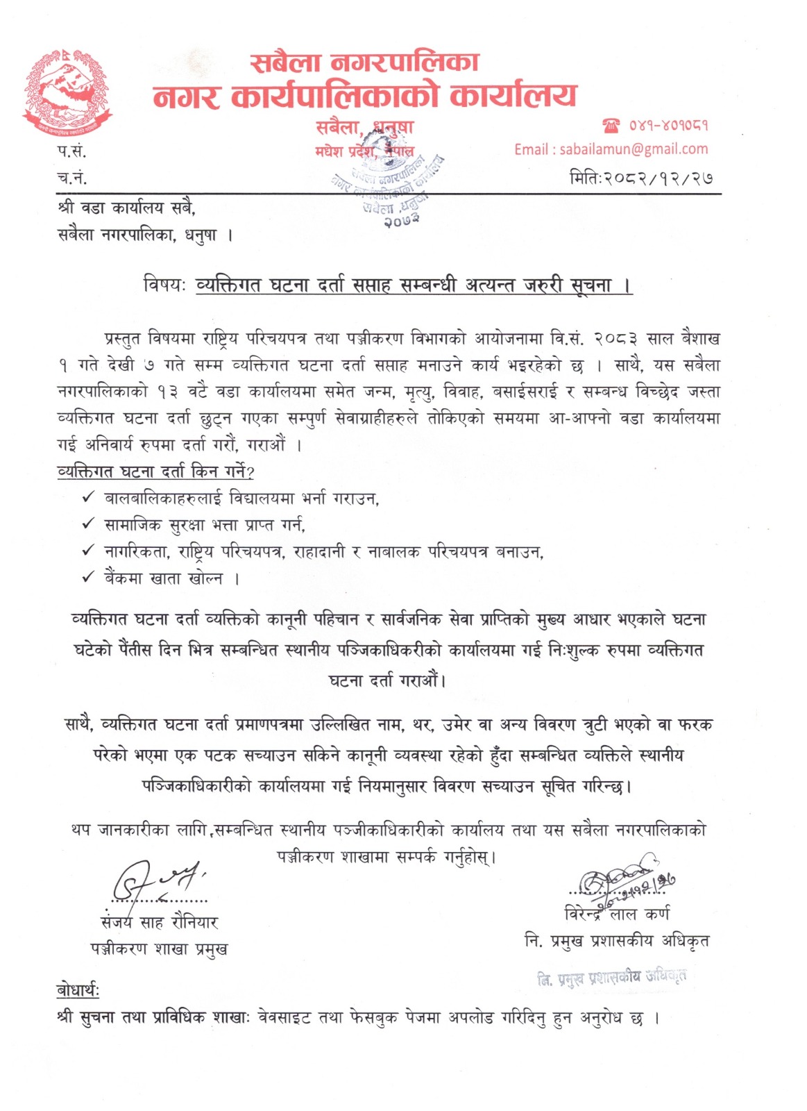 व्यक्तिगत घटना दर्ता सप्ताह सम्बन्धी अत्यन्त जरूरी सूचना ।
